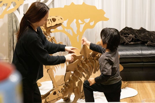 中でも全高180cmのメガティラノサウルスは、複数人での組み立てを前提とした設計となっています。大型ならではのスケール感がもたらす高揚感とともに、参加者同士が力を合わせて完成させる過程において、達成感やその喜びを共有する時間の創出を意図しています。
