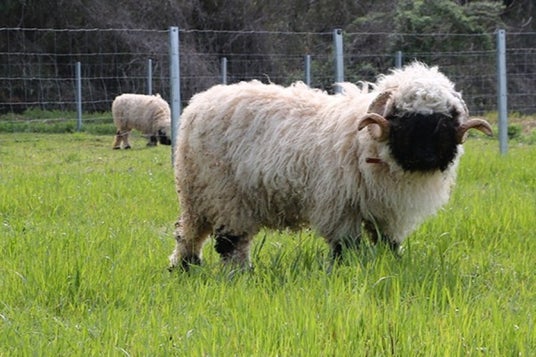 この羊は、スイスのヴァレー州が原産の希少種の羊、ヴァレーブラックノーズシープ。白と黒のコントラストに毛足の長いモフモフの容姿が特徴の、世界的にも珍しい品種です。