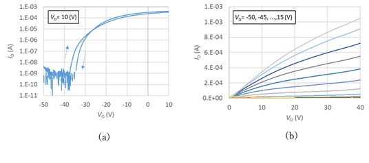 また、図2(b)に示すID-VD特性からは、ドレイン電圧Vdの増加に伴い、線形から飽和特性へと移行する典型的な特性が確認されました。
