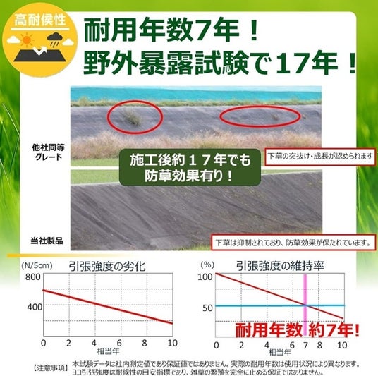 野外暴露試験の結果では17年以上の耐用年数を誇りますが、紫外線を遮断する砂利下に施工した場合、さらに長期的な効果が持続期待され面倒なメンテナンス作業が軽減されます。