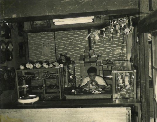 創業当時の店内で、時計と向き合いながら技を磨く若き日の故人の姿。