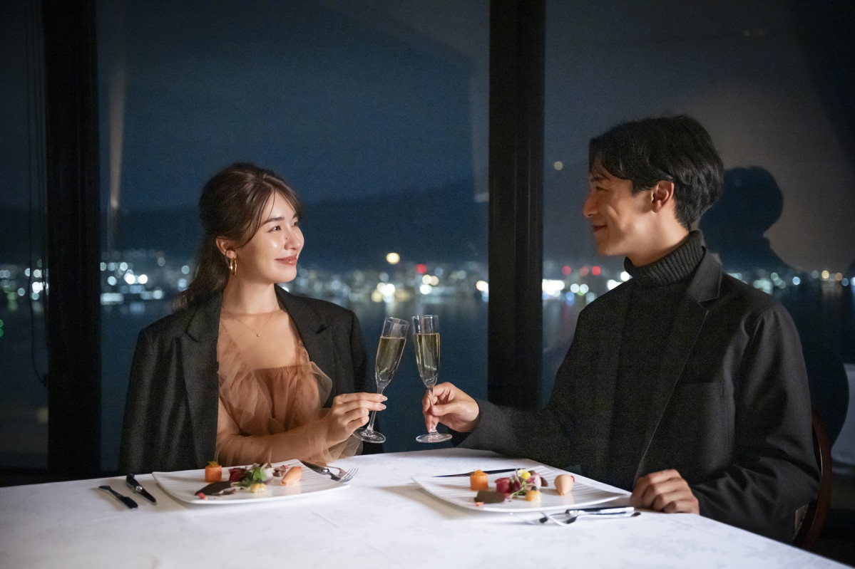 地上約130メートルの高層階から琵琶湖を望むレストランで提供される「バレンタイン・アニバーサリーコース」