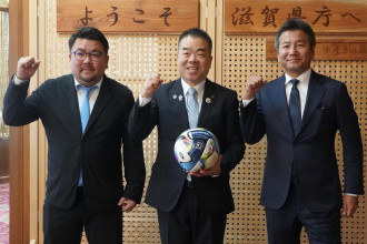サッカーJ3昇格を決めたレイラック滋賀FCの内林広高社長とJリーグの野々村芳和チェアマンが1月30日、滋賀県の三日月大造知事を表敬訪問した。